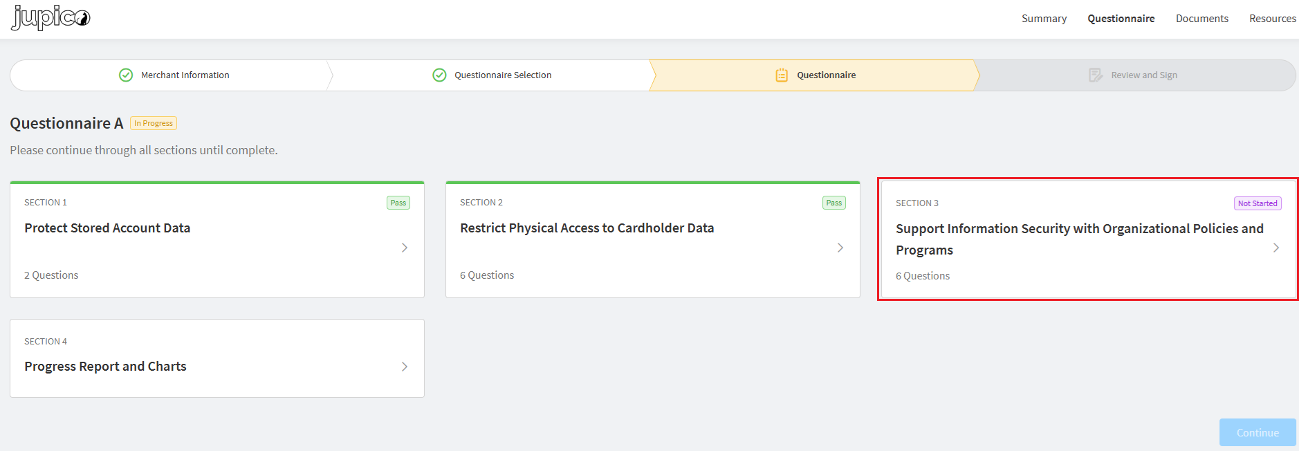 Upon getting started, you will find 8 out of 14 questions have been completed based on the integration methodology your Service Provider uses. This means you do not need to make any changes in the **Merchant Information** or **Questionnaire Selection** sections and just hit “*Save & Continue*” to get to the last section.